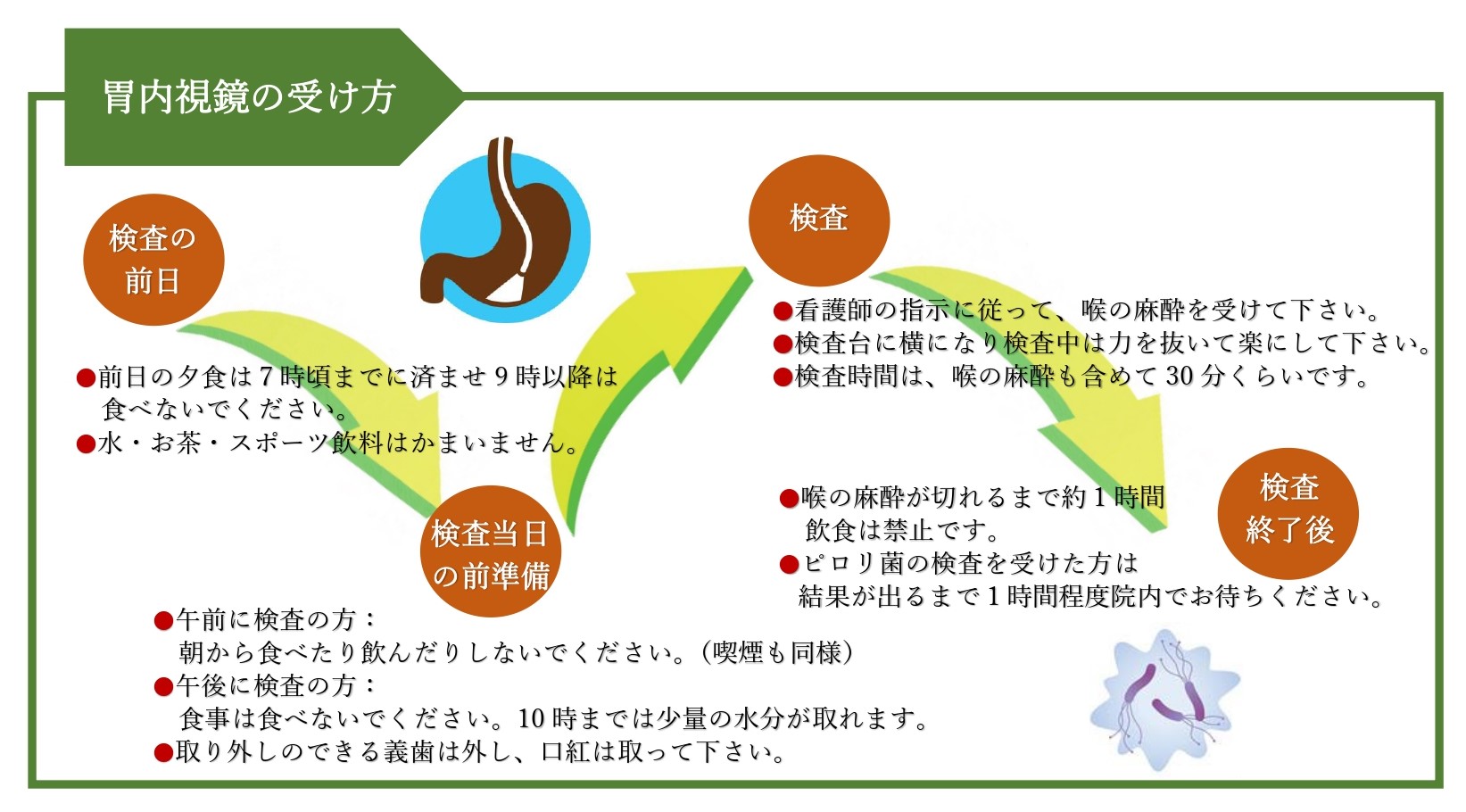 | ○過去に胃潰瘍、十二指腸潰瘍になったことがある ○肝硬変といわれている ○食道がん、胃がんを治療したことがある | 潰瘍は再発することが多い疾患です。肝硬変は食道や胃に静脈瘤を合併し出血することがあります。 がんは治ったと言われていても再発を見逃さないことが大切です。 これらの方は定期的な検査をお勧めします。 |