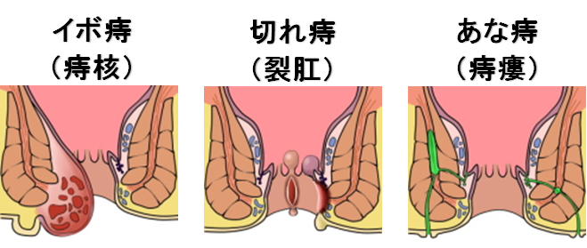 痔とは一般に、内外痔核(イボ痔)、裂肛(切れ痔)、痔ろう(あな痔)を指し、成人の3人に1人が痔であるといわれるほどよくある病気です。男性に多い病気と思われがちですが、女性でも患う人が大変多いです。原因として、便秘や下痢などの排便異常や妊娠・出産などが挙げられます。また男性よりも冷え症の方が多く肛門周辺の血流が悪くなり痔になりやすいのです。